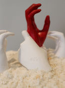 Overall, the appearance of the exhibit is minimalistic and sophisticated. The white walls and windows brighten up the area and draw attention to the bold red elements. The artworks are also placed at eye-level to easily direct the gaze of the audience towards the pieces and help them progress through the exhibit at ease. There is an irony in the appearance of the works because they appear simple and elegant, yet convey such deep messages.